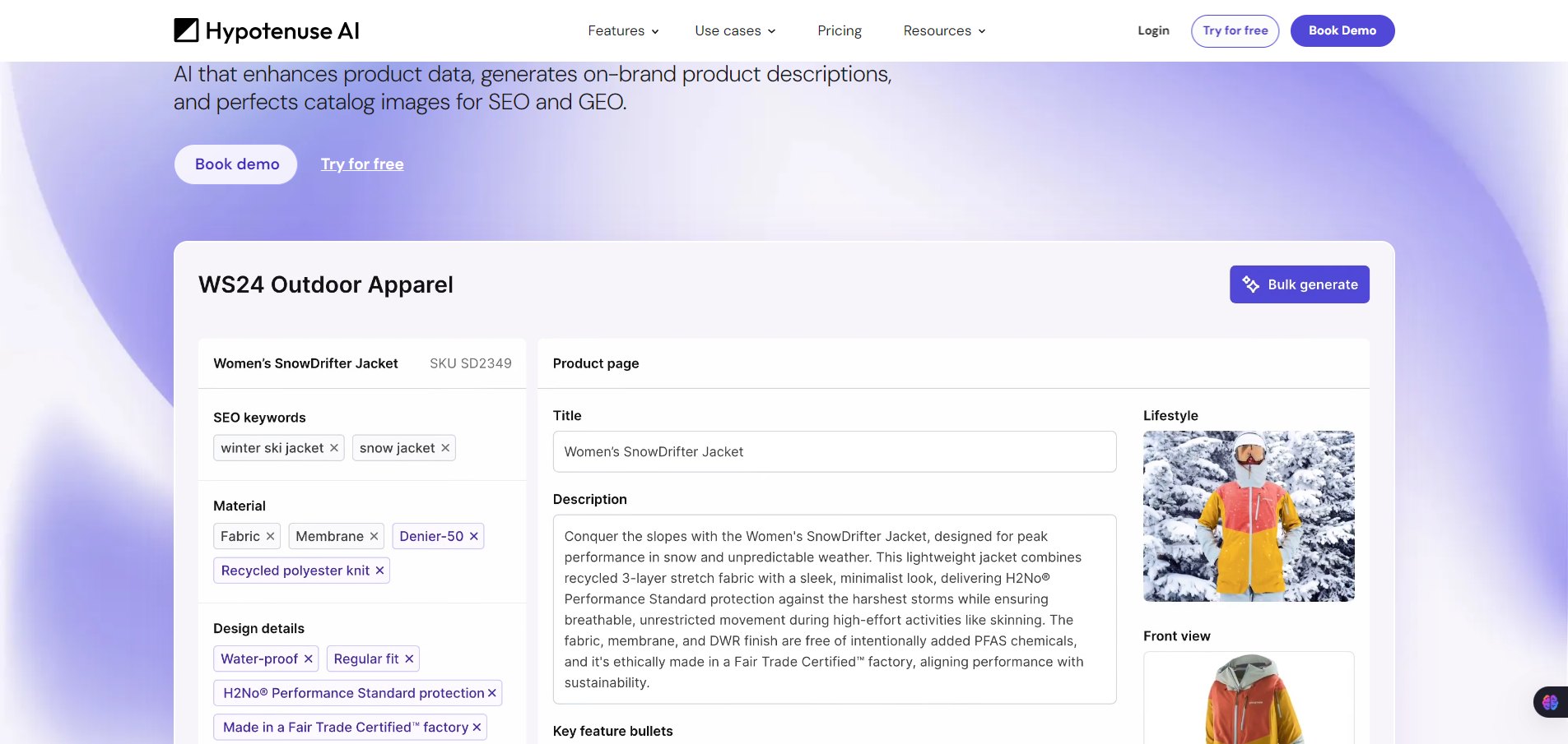 Writing thousands of product descriptions or keeping marketing copy consistent across channels is slow and expensive. HypotenuseAI is most valuable for ecommerce brands, marketplaces, and agencies that need speed, consistency, and SEO-friendly output.