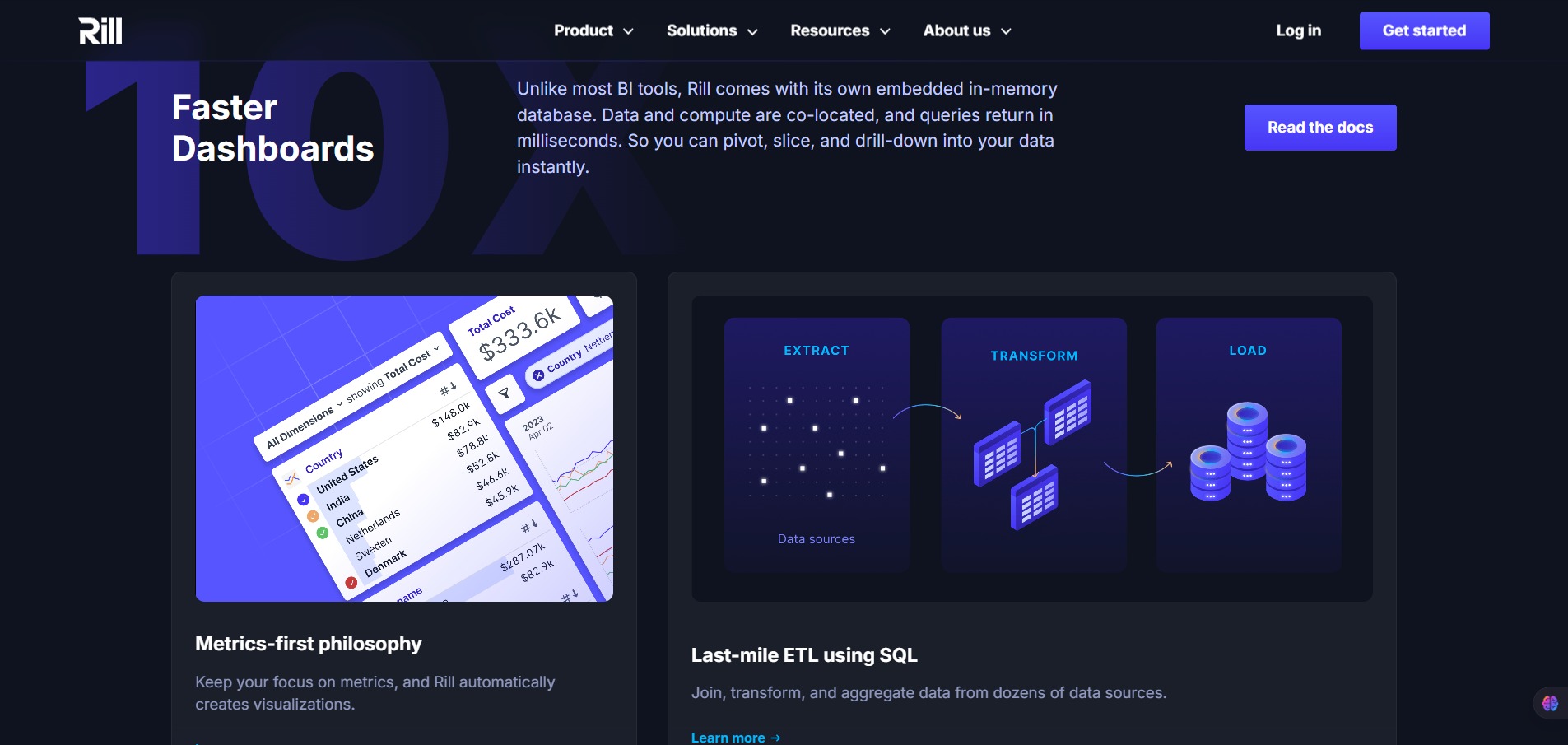 Rill uses a columnar, real-time analytics engine optimized for time-series and event data. You define models and metrics in code, connect streaming or frequently updated data sources, and Rill serves fast, interactive dashboards on top.